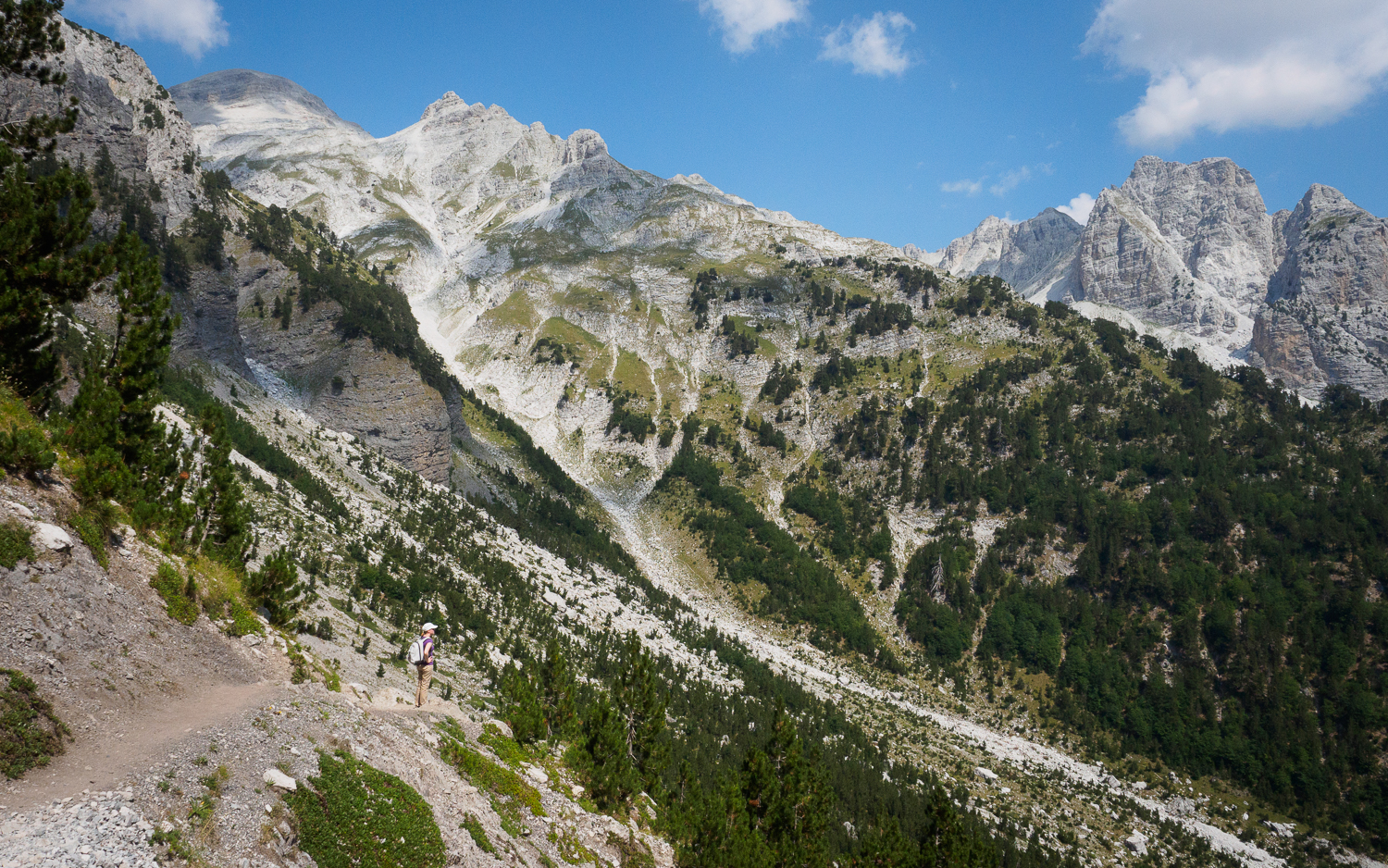 Nach der Rast führt mich der Weg wieder gemütlich bis kurz hinter den Abzweig links zum Qafa e Valbonës und rechts in Richtung Qafa e Pejes und Maja Jezerces. Danach steigt der Weg stark an und erklimmt die Wand, die von unten fast zu steil für einen Aufstieg aussieht. Hier begegnen mir die ersten Wanderer aus Theth. Ich beneide sie nicht. Aus Richtung Valbona muss man 800 Meter zum Pass aufsteigen, aus Richtung Theth 1000 Meter. Dafür ist die Seite Theth nicht so steil.